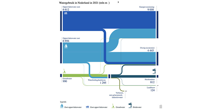 Dit stroomdiagram geeft de stromen van leiding-, oppervlakte- en grondwater in Nederland weer. De breedte van de pijlen geeft de grootte van de stroom aan.