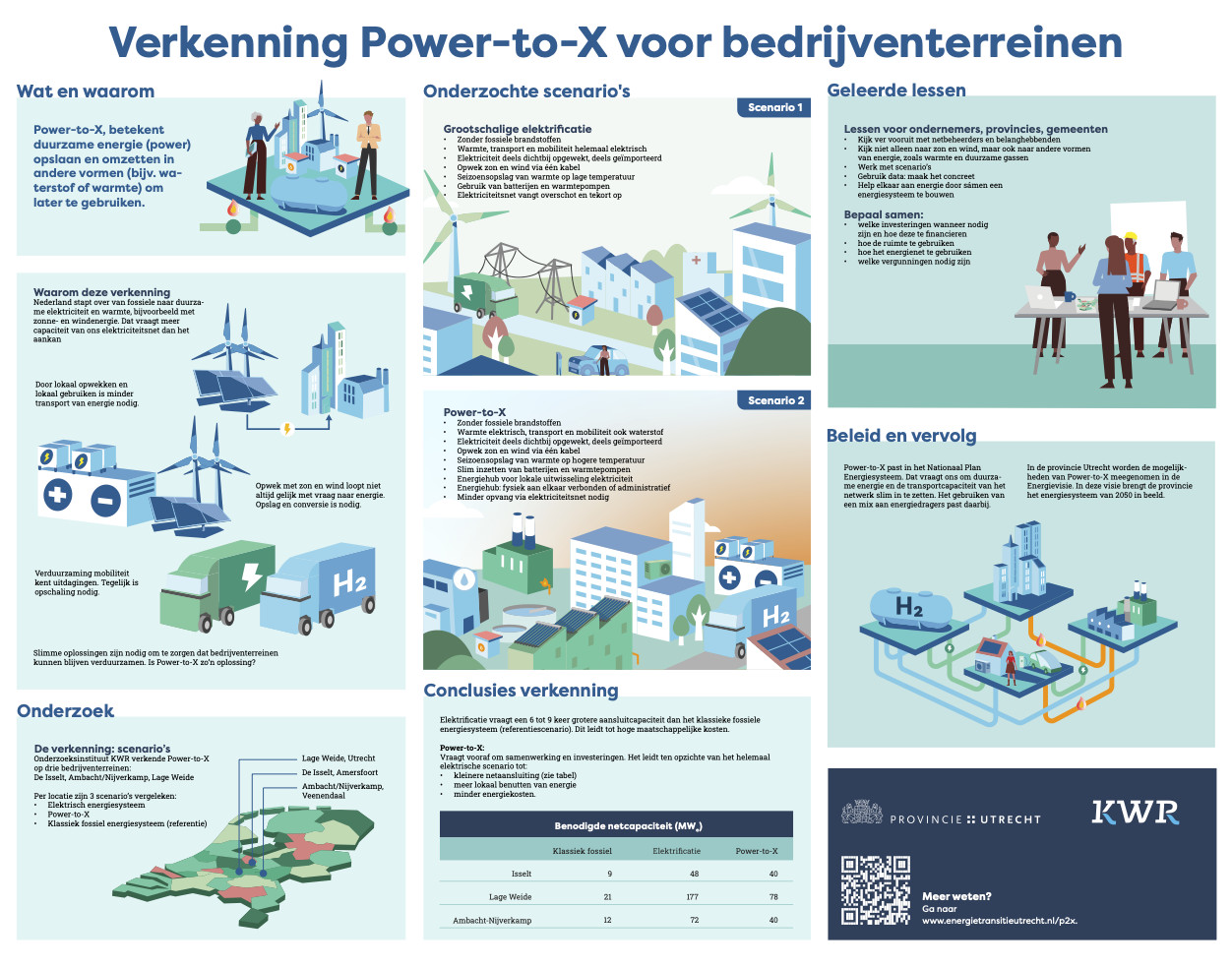 Power-to-X is een slimme oplossing waarbij duurzaam opgewekte elektriciteit wordt omgezet in andere energiedragers, zoals waterstof of warmte. Dit maakt het mogelijk om vraag en aanbod van energie beter op elkaar af te stemmen. Ondernemers op bedrijventerreinen in Nederland kunnen zo efficiënter omgaan met energie en volstaan met een lagere netaansluiting.